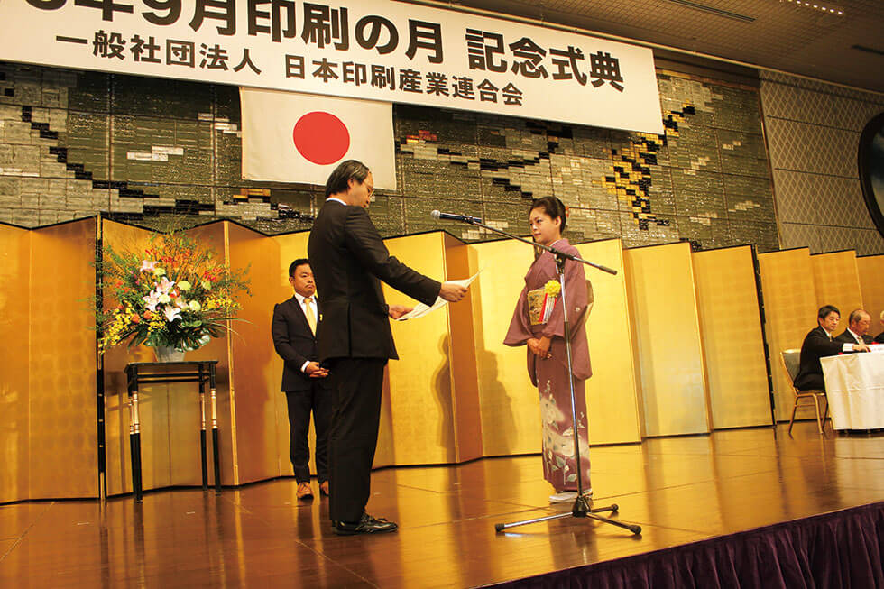 平成28年 9月14日 「2016年9月印刷の月 記念式典」 東京・千代田区 ホテルニューオータニにて弊社取締役 大髙里枝子(写真最左)